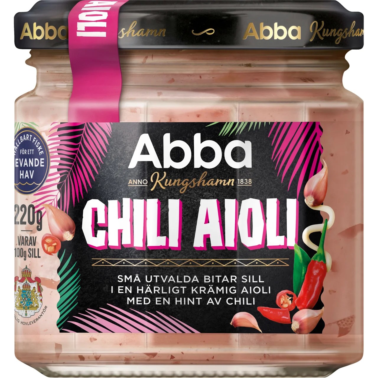 Abba Chilli Aioli je vyrobena ze sleďů nejvyšší kvality s malými vybranými kousky sledě a chutná skvěle po aioli a chilli. Tento produkt obsahuje sledě (Clupea harengus) nejvyšší kvality, které jsou loveny v severovýchodním Atlantiku. Ryby jsou skladovány v našem skalním skladišti v Kungshamnu na západním pobřeží Bohuslänu, než jsou smíchány s lahodnou krémovou omáčkou, abyste si mohli vychutnat svůj oblíbený produkt. Sledě jsou stejně vhodné na Vánoce, Velikonoce a letní slunovrat jako na rychlý oběd nebo večeři, nebo proč ne na brunch? Tato konzerva sledě je označena symbolem nízké uhlíkové stopy.